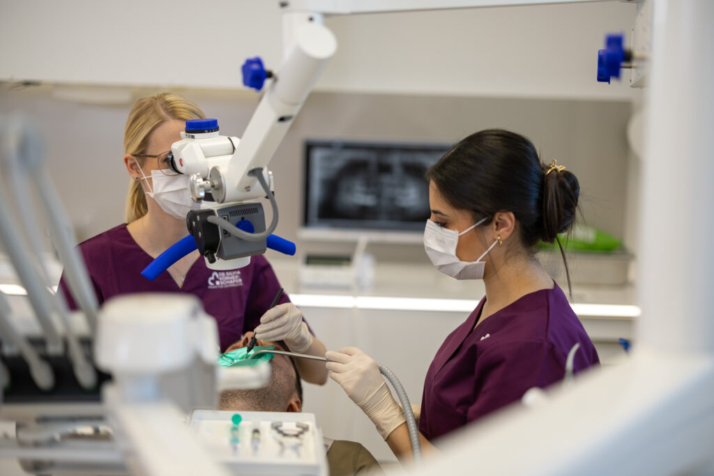 Die Behandlung wird bei uns unter einem Spanngummi, dem sogenannten Kofferdam, sowie unter Zuhilfenahme eines Dentalmikroskops durchgeführt. Durch dieses können auch schwer sichtbare Kanäle oder anatomische Besonderheiten dargestellt werden und die Erfolgsaussichten für den langfristigen Zahnerhalt steigen deutlich.