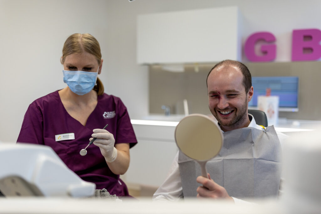 Ein Bleaching, also das Aufhellen der Zähne, kann Ihnen strahlende, weiße Zähne schenken. Dabei gibt es verschiedene Möglichkeiten des Bleachings. Sprechen Sie uns einfach an. Wir gehen ganz individuell auf Ihre finanziellen Vorstellungen und Möglichkeiten ein, sodass Sie am Ende des Tages mit einem strahlenden Lächeln nach Hause gehen. Bleachings sind, in der Zahnarztpraxis ausgeführt, im Allgemeinen unbedenklich, zuvor sollten wir jedoch Ihre Mundgesundheit überprüfen.